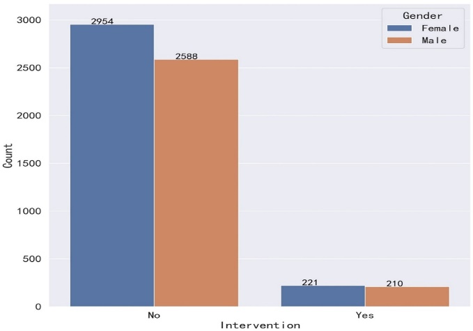 The relationship between gender and intervention status was also examined. Male and female distributions were visually compared between the pre- and post-intervention groups, as illustrated in Figure 2, which suggested similar proportions. Chi-square correlation analysis produced a value of 0.517 with a P-value of 0.4710. Since the P-value exceeded 0.05, it indicated that patient gender was not significantly associated with whether they received the intervention.