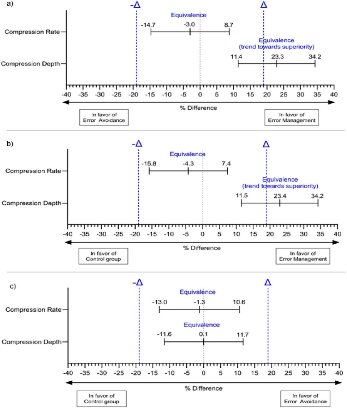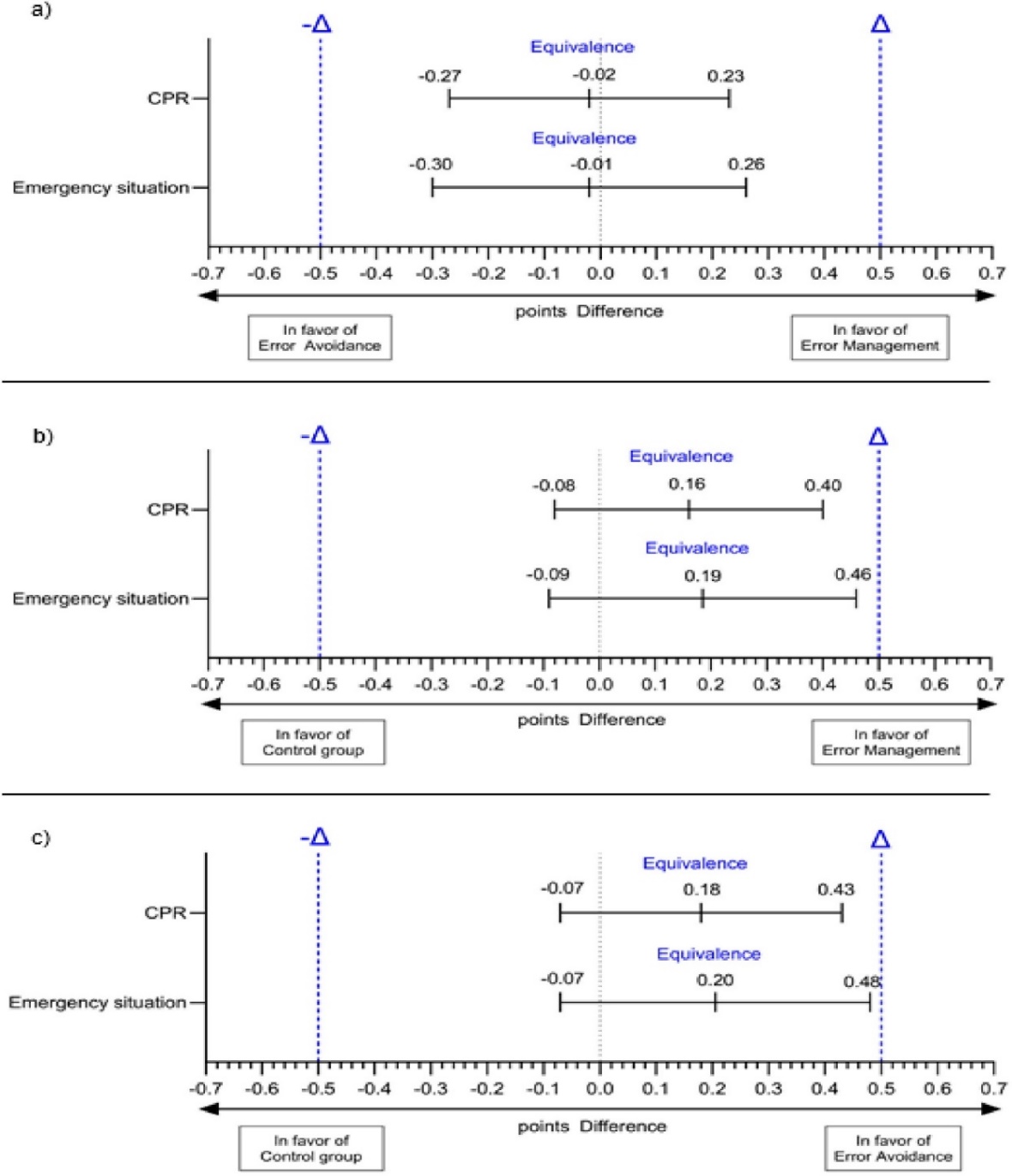 Figure 3. Equivalence analysis for the secondary outcome parameter across different error-handling instructions (i.e., EM, EA, control): (a) shows the equivalence analysis comparing EA with EM, (b) presents the equivalence analysis of the control group versus EM, and (c) illustrates the equivalence analysis of the control group versus EA |